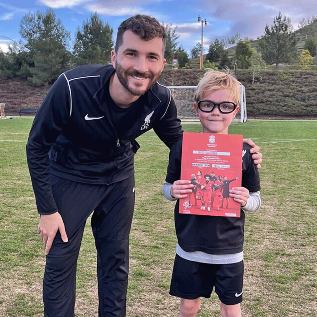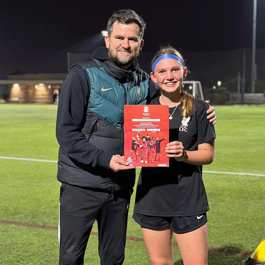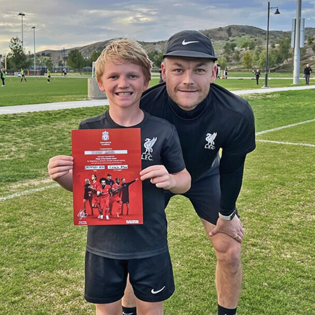 Coach Max Dolton applauds Trevor’s unwavering commitment, showcasing not just skill improvement, but also embodying the true spirit of Liverpool values. Well done, Trevor!